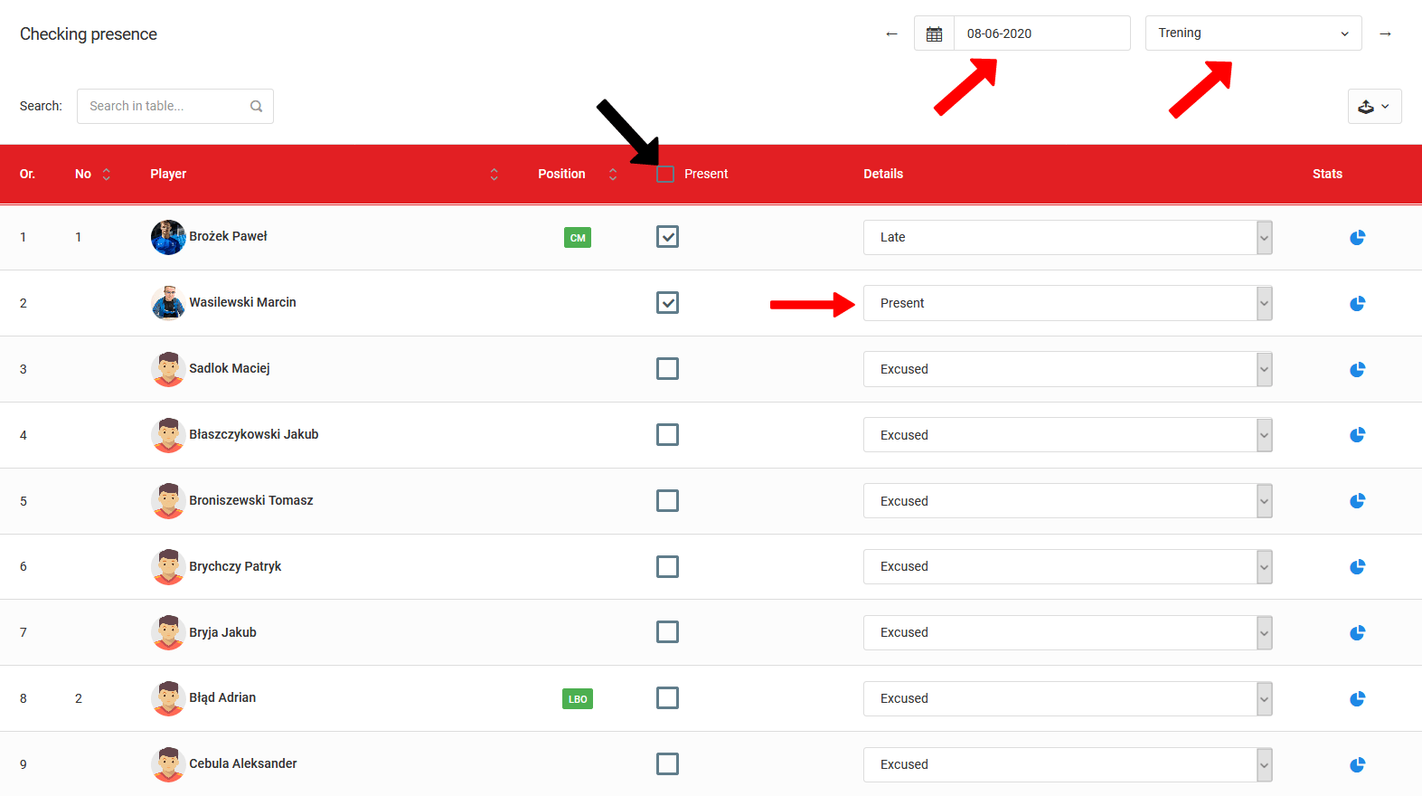 There are several important elements in the presence check a window. Going from the top: two checkboxes in the top right corner. There you choose a date and relevant training. Remember that you have to create a training session to check presence. You can create more than one training per day. You can also plan your training via the mobile app. Another important element is the checkboxes, where you can select the presence of a player in the training. In the details column, you can select the reason for the absence from the drop-down list.