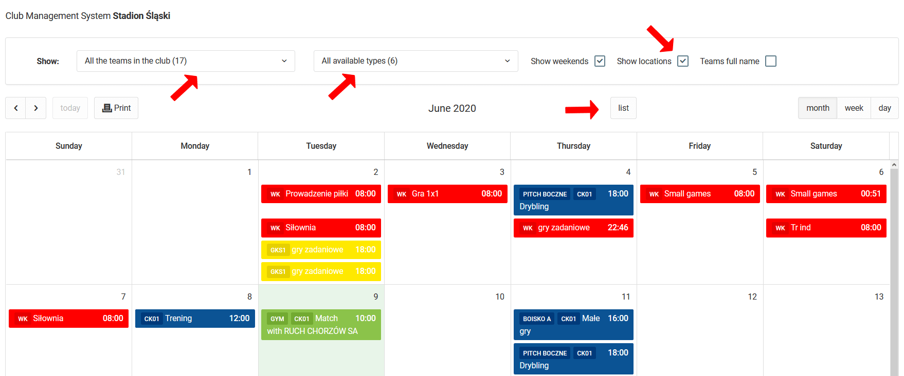 By pressing the "list" button, the calendar will take a tabular form, so you can conveniently save it as a pdf or print. Colours of events - training, will be in the colours of the teams. You can change the color of the team in the team edit window.