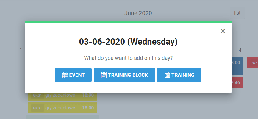 As a system administrator you have the possibility to add three types of events to your club calendar. Traditional event, training block and training. To add an event to the calendar, click on any day on the calendar and choose one of the three options that will appear on the screen.