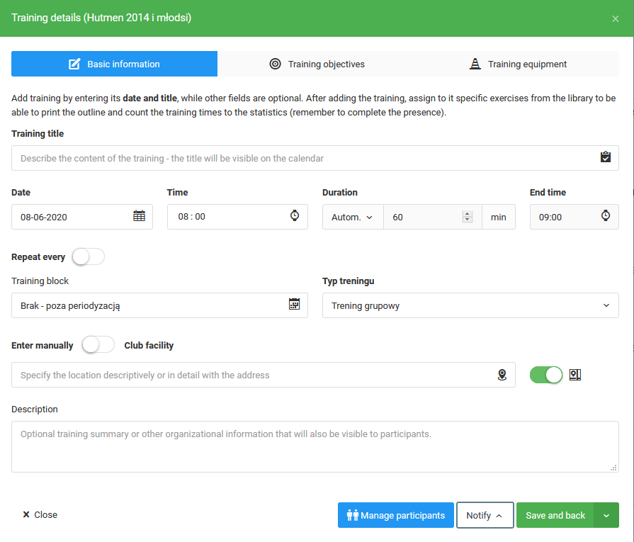 The first step in creating training is to name it and specify the date, time and duration. The duration can be set manually, or it will be counted as the sum of the times of the used exercises. The next step is to specify the location of the workout. You can either enter it manually or select it from a predefined list of objects that are created in the object module.