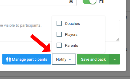 Veidojot treniņa sesiju, jums ir iespēja iestatīt dalībnieku (spēlētāju) un treneru (personāla) sarakstu. Izvēlētais spēlētāju saraksts atbildīs spēlētāju sarakstam apmeklējuma sarakstā, kad to pārbaudīsiet. Treneru saraksts, kas atzīmēti kā konkrētā treniņa personāls, tiks parādīts melnrakstā. No šejienes jums ir arī iespēja iecelt spēlētāju no citas komandas plānotajam treniņam. Dalībnieku paziņošana par treniņu balstās uz lietotāju grupu atlasi, kurām tiks nosūtīts paziņojums. Tas parādīsies gan mobilajā lietotnē, gan sistēmas tiešsaistes versijā.